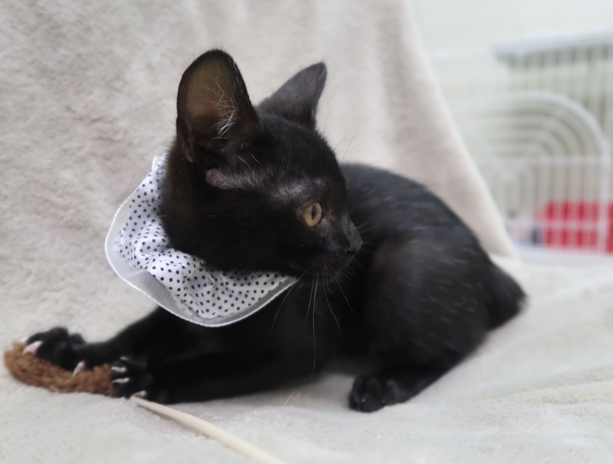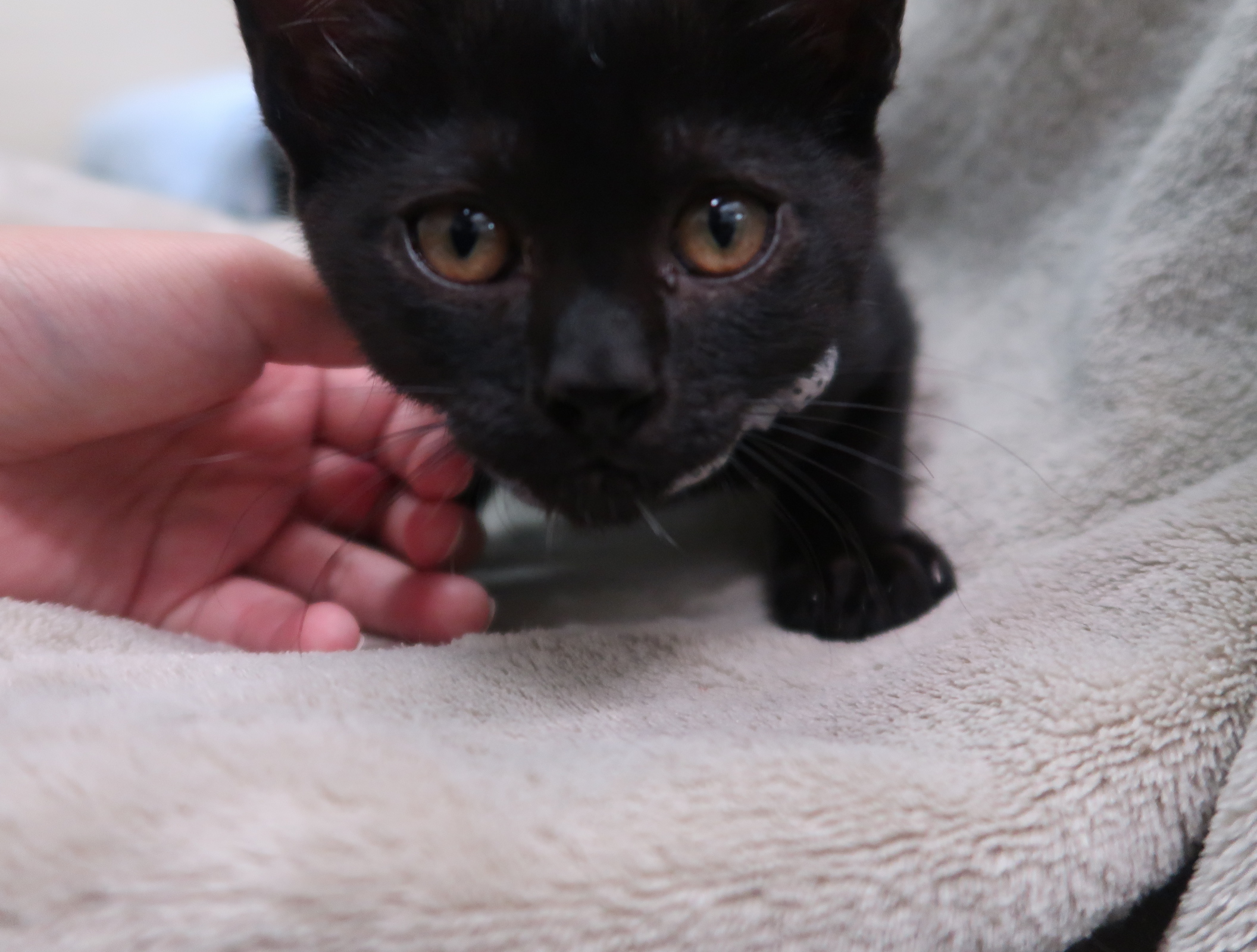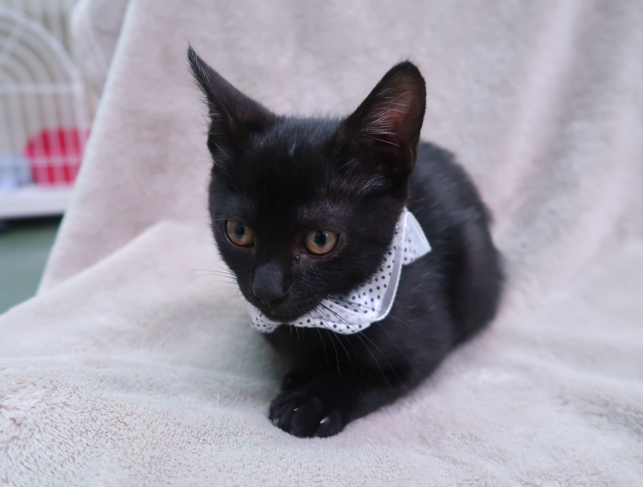 黒い毛並みにところどころ白い毛が混じっています。甘えん坊で、人がいるとずっとゴロゴロ喉を鳴らしています。去勢手術が未実施のため、6ヶ月齢になりましたら、手術を行っていただき、報告書のご提出をお願いいたします。最後まで責任をもって飼っていただける方お願いします。