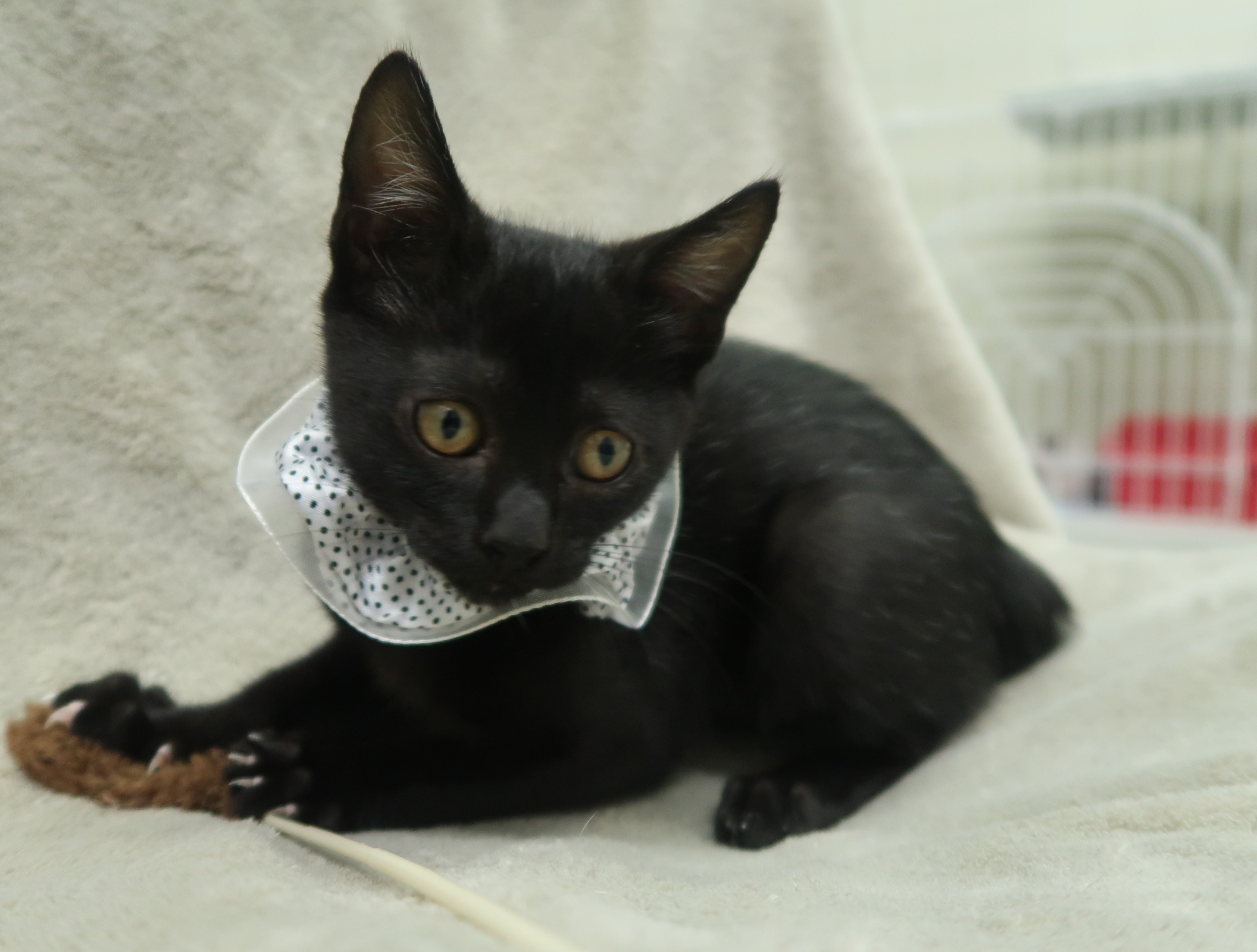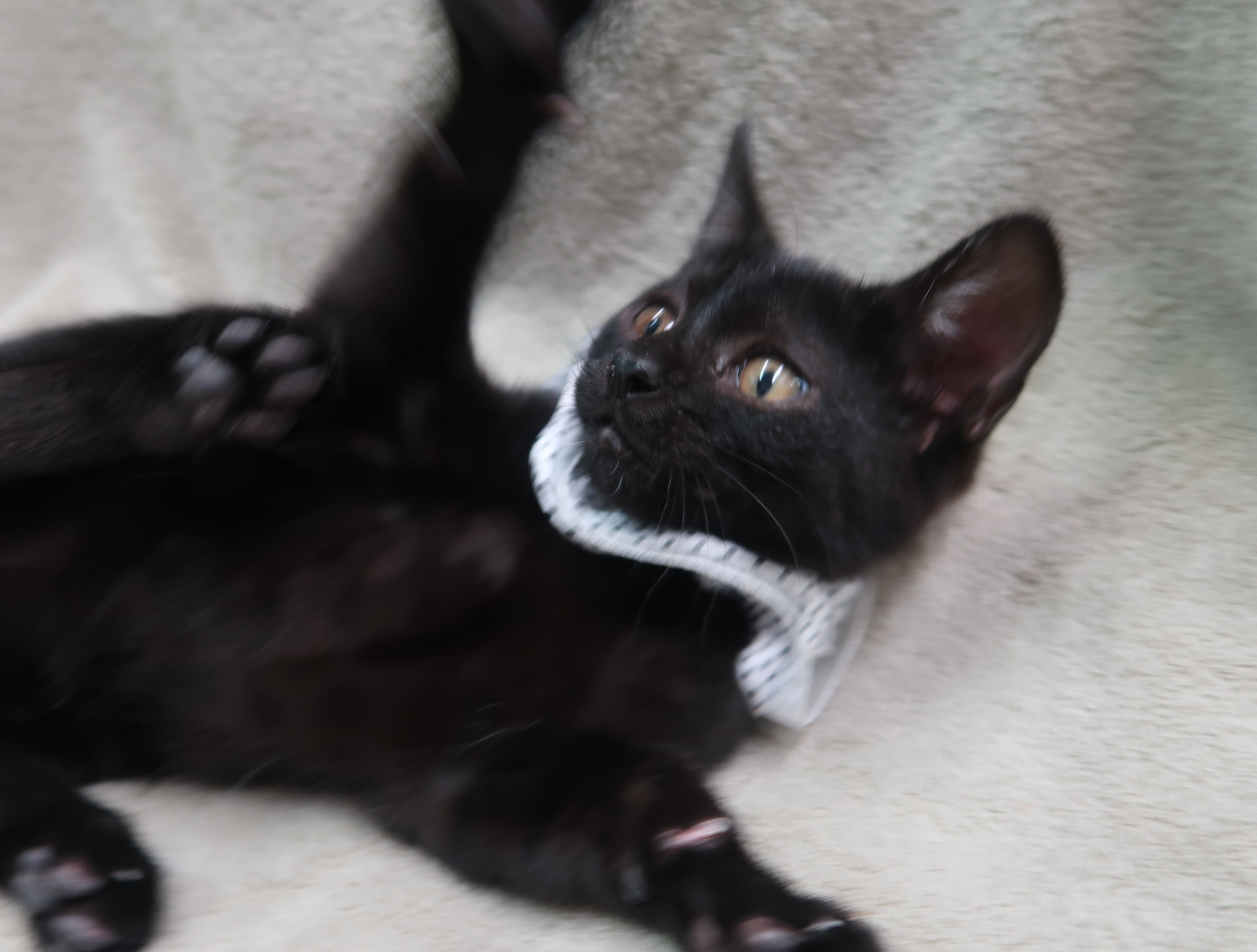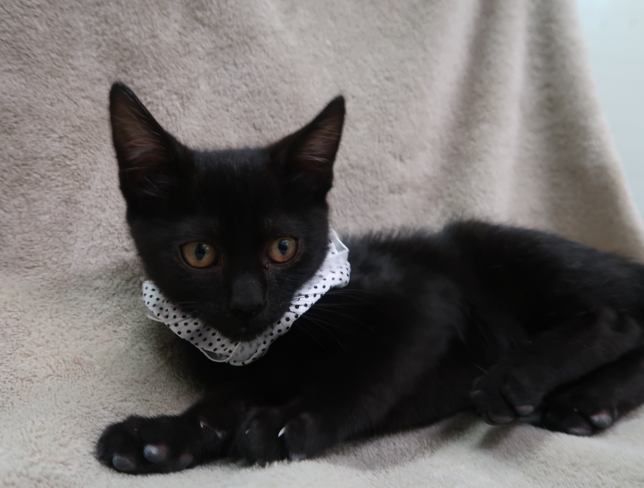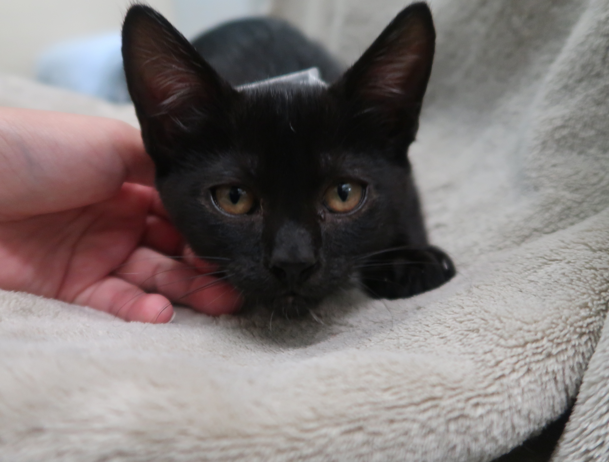 黒い毛並みにところどころ白い毛が混じっています。甘えん坊で、人がいるとずっとゴロゴロ喉を鳴らしています。去勢手術が未実施のため、6ヶ月齢になりましたら、手術を行っていただき、報告書のご提出をお願いいたします。最後まで責任をもって飼っていただける方お願いします。