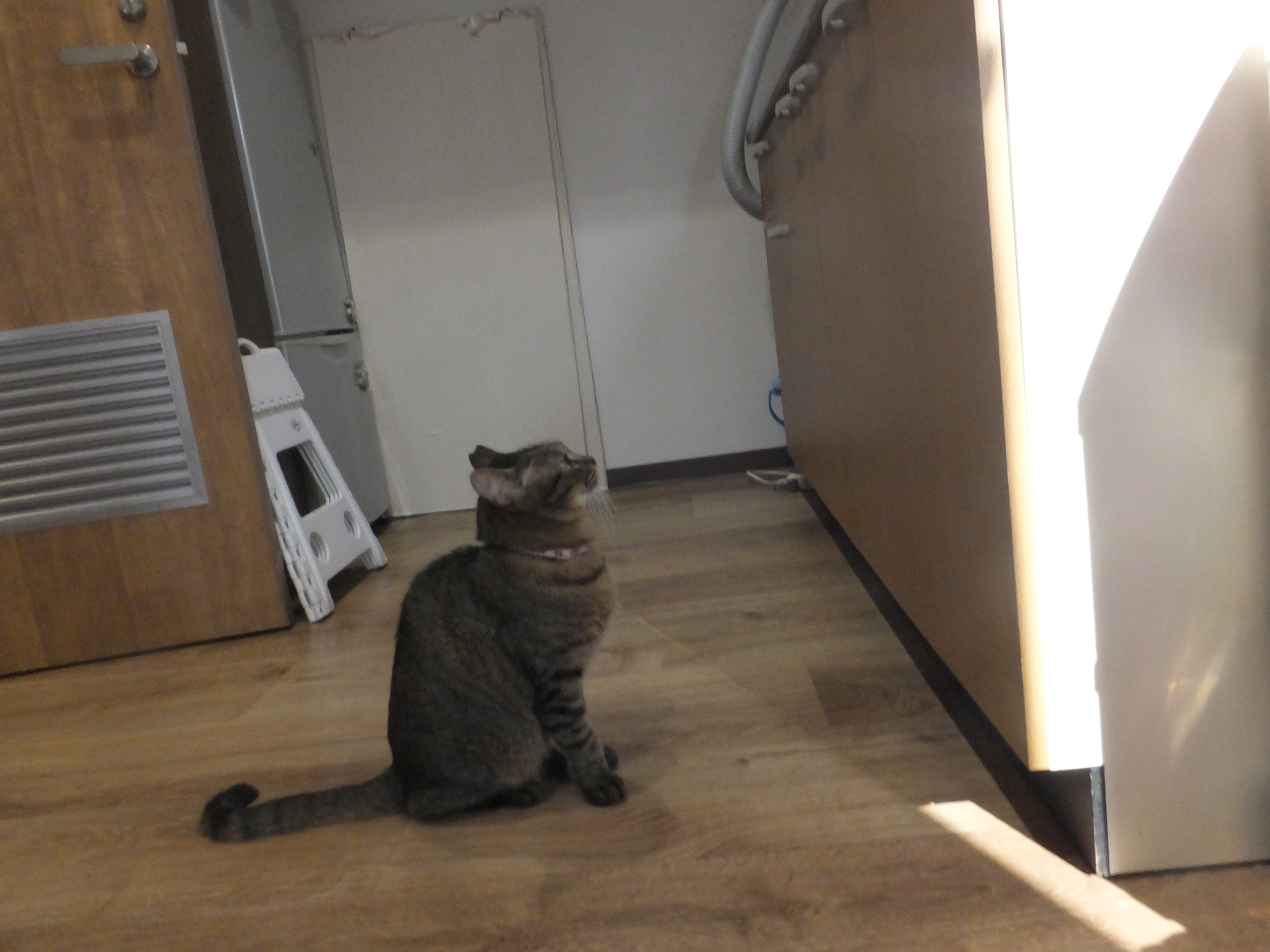 知らない人がいると隠れます。気分屋ですが、しばらく様子見の後、出てくると、触ってもらおうと前を行ったり来たりします。